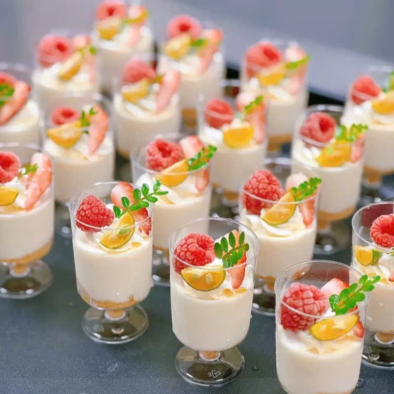 - Ly đựng bánh mousse/panna cotta tròn có chân, dùng để trang trí tiệc cưới, buffet.
